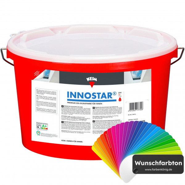 KEIM Innostar ist eine hochdeckende, hochergiebige und wohngesunde Premium SolSilikatfarbe für den Innenbereich nach DIN EN 13 300 (erfüllt auch die Anforderungen nach DIN 18363 Abschnitt 2.4.1, Dispersionssilikatfarbe).